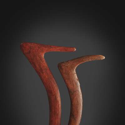 Boomerangs such as the present examples (known as a “number seven” on account of the shape), were primarily crafted by the Tanami desert peoples but circulated widely across central and northern Australia through extensive inland trade networks. While mainly used in combat, they were also effective for bird hunting, as they could knock birds from flocks in flight, making them easier to catch. Like most Aboriginal boomerangs, they did not return when thrown.