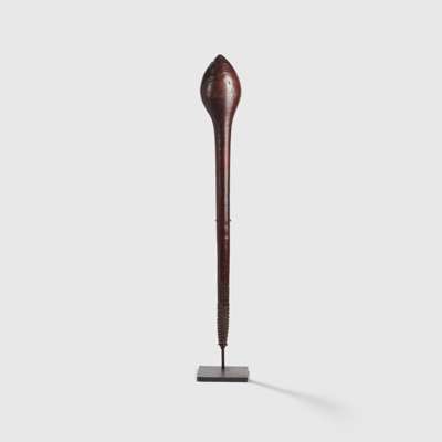 carved wood, with rounded bulbous striking head tapering to a narrow handle with incised grip, rich patination, raised on a bespoke mount
