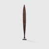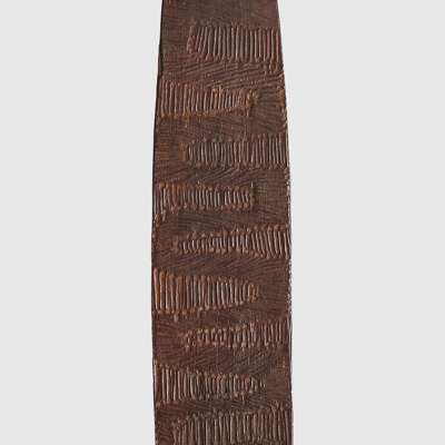 carved wood, of elongated elliptical form, with deep linear carved geometric decoration, gum resin handle and possum tooth hook, raised on a bespoke mount