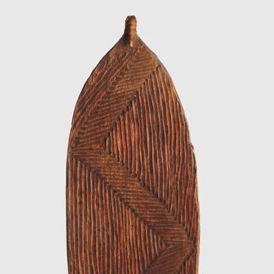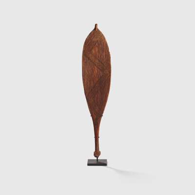 carved wood, fibre and tooth, the body displaying engraved chevron and line motifs across both faces, the distal end with fibre binding holding a kangaroo tooth, raised on a bespoke mount
