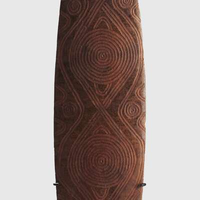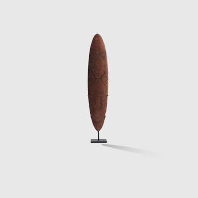 carved wood, finely incised with concentric circle and linear designs arranged in a symmetrical composition along both faces, the end tapering to rounded points, raised on a bespoke mount
