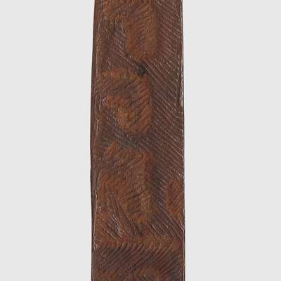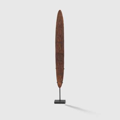 carved wood, of elliptical form with incised geometric decoration, raised on a bespoke mount