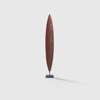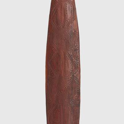 carved wood, elongated oval with pointed ends, with incised linear and zigzag designs and dark patination, raised on a bespoke mount