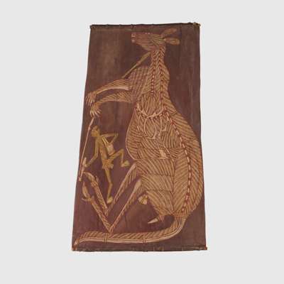 natural earth pigments on eucalyptus bark, depicting a Mimi spirit hunter and kangaroo