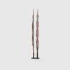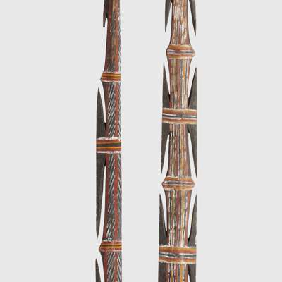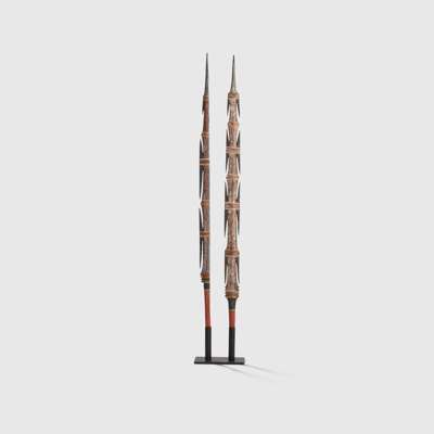 carved wood and pigment, each with raised geometric ridging and alternating painted sections in ochre, white and black pigments, raised together on a bespoke mount