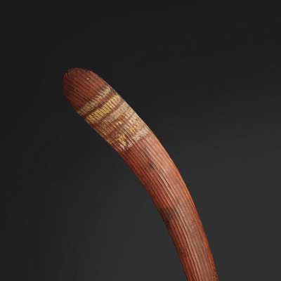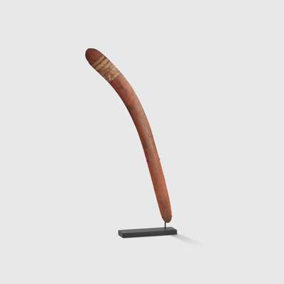 carved wood and pigment, a large example, displaying a subtle taper, with vertical fluting throughout, painted bands in white and yellow to one end, raised on a bespoke mount