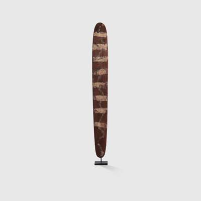 carved wood, natural earth pigments and feathers, of long elliptical form, with engraved vertical bands and concentric circles, adorned with a series of painted horizontal white bands, remnants of applied white feathers, raised on a bespoke mount