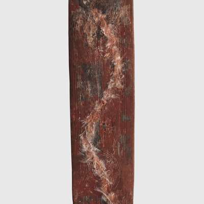 carved wood, natural earth pigments and feathers, of long elliptical form, with engraved vertical bands and concentric circles, applied white feathers running in a zig-zag along the entire length, raised on a bespoke mount