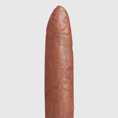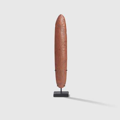 carved wood, adorned with incised concentric circles and an ochre wash, raised on a bespoke mount