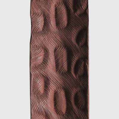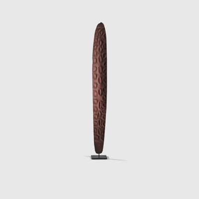 carved wood, elongated, slightly convex form tapering towards each end, rhythmic surface patterning incised with concentric circle designs to both sides, raised on a bespoke mount