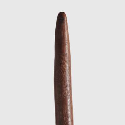 carved wood, of slender form, with a rounded striking head and finely incised decorative engravings, presented on a bespoke display mount