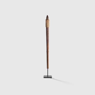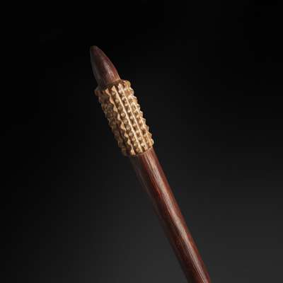 carved wood, with a pointed finial to one end and a distinct “pineapple” head formed by deep geometric lattice-carved motifs to the midsection, the shaft tapering to a rounded point with incised banding for ease of grip, the surface with a rich, dark patina, raised on a bespoke mount