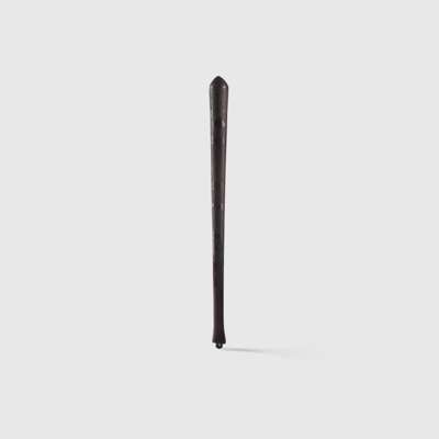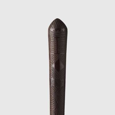 carved wood, with subtly flaring head and integral loop at base, decorated with geometric carvings across the upper three-quarters, including a crucifix glyph below the striking end