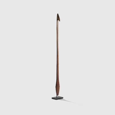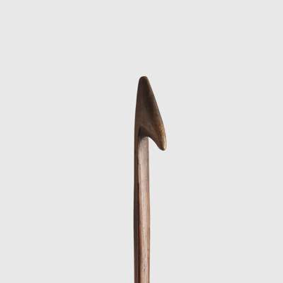 carved wood, of relatively narrow and elongated form, with a curved, teardrop shape tapering into a rounded handle, an integral wooden hook at the opposing end, raised on a bespoke mount