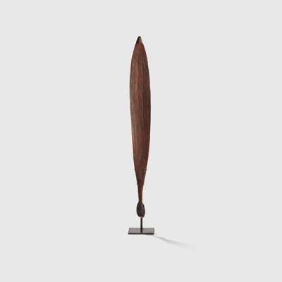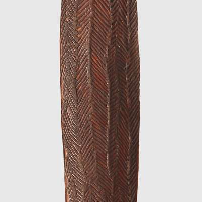 carved and incised wood with gum handle, tooth incised decoration, hook attached with fibre and a red ochre wash, presented on a bespoke mount
