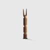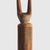 wood and pigment, carved from a single log with a tall bifurcated finial and cylindrical shaft, the surface decorated with traditional Tiwi geometric forms in red, white, yellow and black