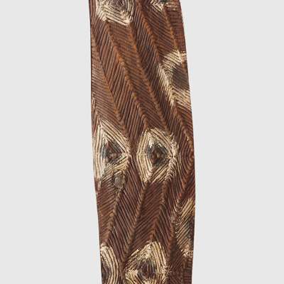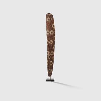 carved wood and pigment, of elongated elliptical form, the surface finely incised with linear grooves and painted with a dot motif in natural pigments, raised on a bespoke mount