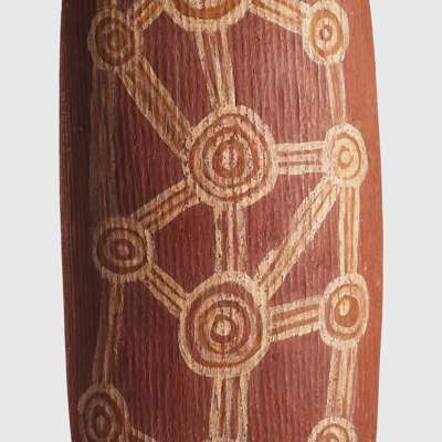 The coolamon is a multipurpose wooden vessel used for carrying food, water, or babies, and for gathering plants. Each one was carved from a single piece of wood, then shaped with heat to form its gentle curve. The surface was often decorated with patterns that reflected local traditions and stories. Beyond its everyday use, the coolamon also carried symbolic meaning, representing care, nourishment, and connection to the land.