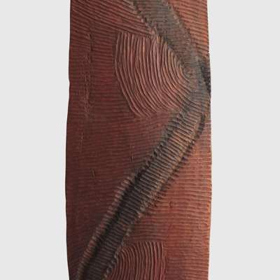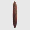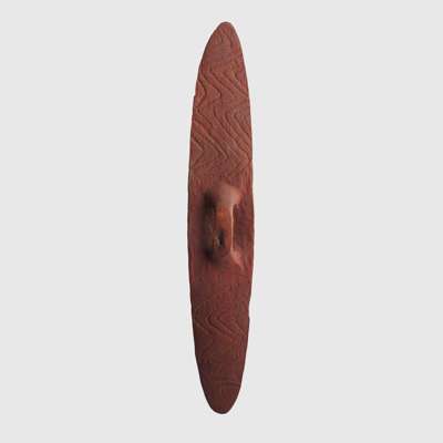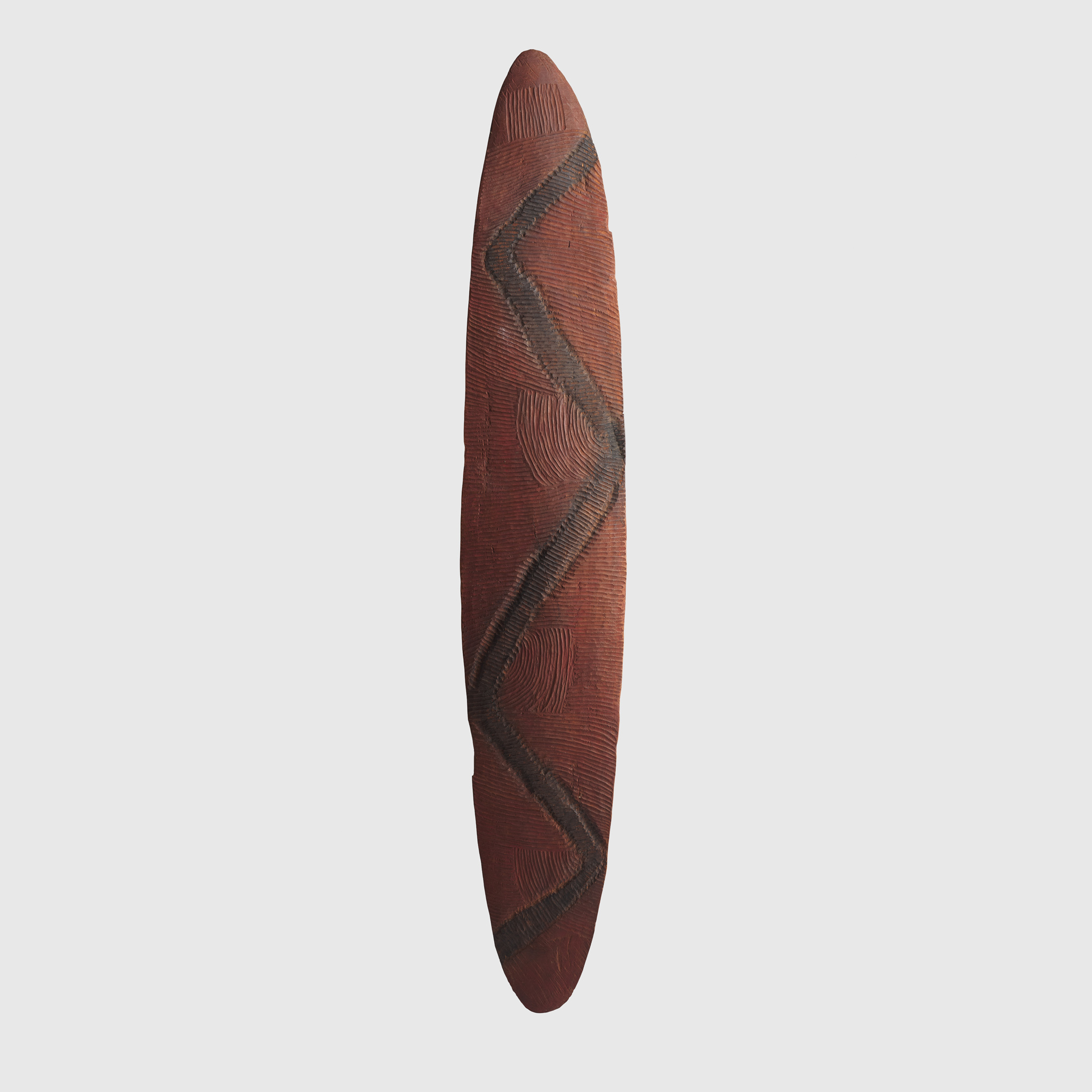 carved wood and pigment, of elliptical form, the obverse engraved with fluting and featuring a serpent motif in black pigment against an ochre ground, the reverse with zig-zag fluting and an integral handle, raised on a bespoke mount designed for wall installation