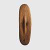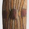 carved wood and natural earth pigments, of oval form with a central protruding boss, the obverse adorned with a dynamic and rhythmic composition characteristic of northern Queensland styles, with integral handle to reverse