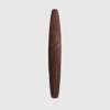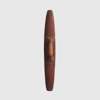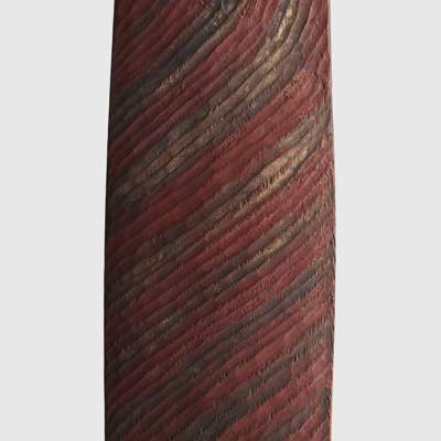 carved wood and pigment, of elliptical form, the obverse engraved with fluting and featuring a motif of alternating ochre and black sweeping bands, the reverse with an integral handle, raised on a bespoke mount designed for wall installation