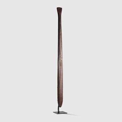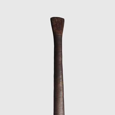 carved wood and natural pigments, tapering from a rounded striking head to a narrow grip with flared terminal, remnants of painted pattern to the striking end, raised on a bespoke mount