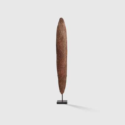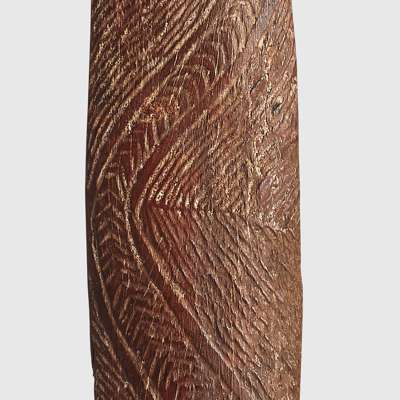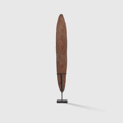 carved wood, of elliptical form with incised geometric decoration depicting a snake, raised on a bespoke mount