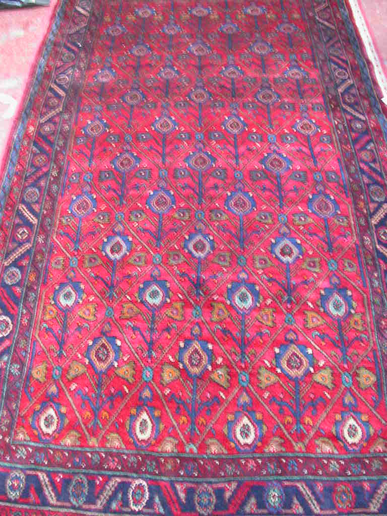 the red field with allover floral lattice pattern, within indigo rosette and scrolling vine border between red and blue bands