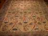 the cream field with allover pattern of serrated leaves, flowerheads and birds, within indigo turtle palmette and scrolling vine border between bands
