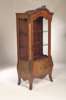 the arched cornice above shaped glazed door, above marquetry panel and sides, on cabriole legs with cast sabots