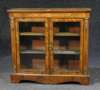 the rectangular top above marquetry inlaid frieze and two glazed doors, enclosing shelves, flanked by gilt metal mounted columns, shaped apron and bracket feet