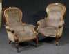 the button upholstered balloon back, scrolled arms and serpentine seat on turned fluted tapering legs with wooden castors and another similar (2)