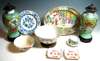 with pierced wooden covers and stands, profusely decorated with flowers on a turquoise ground, and cartouche panels depicting stylised landscapes; two Chinese bowls and a Chinese oval dish decorated with figures; a Meissen style blue and white plate; a Meissen small cup and saucer; and two Continental red and white small dishes (10)