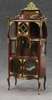 with Rococo style gilt metal mounts and porcelain plaques, mirror back above arrangement of open shelves and glazed cupboards