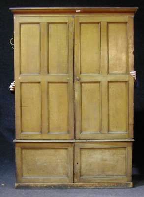the moulded cornice over quarter panelled door, with pigeon holes inside over squat cupboard, base on plinth