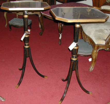 with gilt lining, the octagonal tilt top raised on turned pedestal and sabre legs (2)