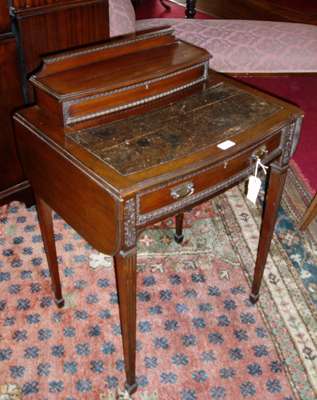 the rounded rectangular top with inset writing surface, surmounted by a stationery cabinet with hinged lid, above bowfront frieze drawer, on square tapering legs with fluted decoration and spade feet