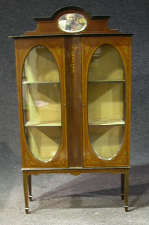 the top with arched oval mirrored pediment, above two panelled and glazed doors, enclosing shelves, on square tapering legs