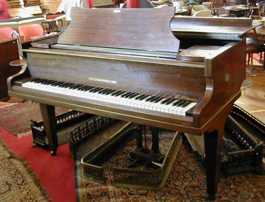 a mahogany cased baby grand piano, the overstrung iron frame above keyboard of seven octaves, raised on square tapering legs