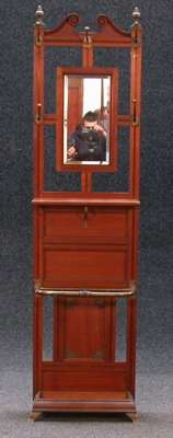 the broken pediment above bevelled glass mirror and shelf below, to umbrella well, on gilt metal ogee bracket feet,