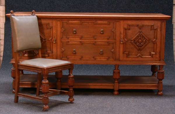 comprising a sideboard the two short drawers flanked by cupboards decorated with formal motifs, on carved baluster supports, united by a lower shelf, on turned inverted cup feet, 199cm wide; a set of ten dining chairs, upholstered in sage green leatherette; and an extending dining table, complete with three leaves,