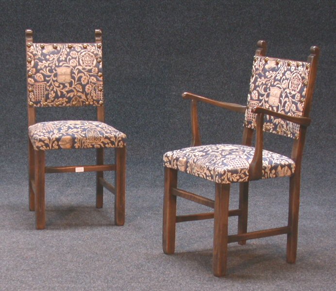 comprising a medieval style sideboard on stretchers, 184cm wide, a set of four chairs upholstered in armorial designed fabric, two matching carvers and a refrectory dining table,