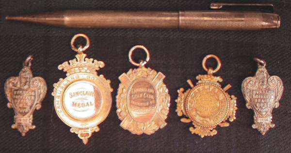 'Evening Dispatch Braids Golf Trophy', 1952; another, 1954; three other Cambuslang Golf Club gold golfing medals, all to A.G. Park; an engine engraved, silver propelling pencil, inscribed 'George' and an Imperial Golf Co., alloy head putter (7(