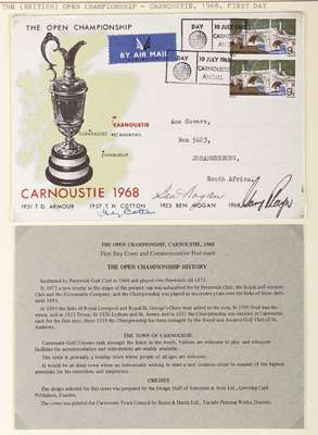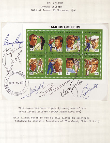 It is an impossible task to do justice in any attempt to summarise the Schulenburg collection and we highly recommend personal viewing to truly appreciate this collection. It is contained within eleven volumes of Dr. Schulenburg's enthusiastic pursuit of all kinds of philatelic items relating to golf - stamps (perfect, imperfect, souvenir sheets, colour proofs), First Day Covers, Commemorative Covers, postal stationery cards and covers, slogan and slogan meter cancels, airletters, and a very generous sprinkling of signatures by golfers, stamp designers and administration. The range of items is comprehensive all are neatly presented on album pages with detailed explanatory notes and illustrations. Contained within this collection are a number of items with impressive pedigrees. There is no room to detail each item, but some of the highlights of the collection include the following:* Open Championship Commemorative Covers 1968-94 (except 1972 when there was no Cover produced, and 1969 and 1971 when only slogan cancels were used). Included is the scarce Cover for 1976, and the four Covers issued in 1968 with each signed by Cotton and Ben Hogan (previous winners at Carnoustie) and Player the '68 Champion - a rare quartet of covers; also the 1983 Cover signed by four previous winners at Royal Birkdale, Thomson, Palmer, Trevino and Miller, as well as the '83 Champion Watson. * The 1991 St. Vincent 'Famous Golfers' Collective Sheet of eight golf greats and signed by seven of those depicted (Bobby Jones deceased) - Player, Nicklaus, Faldo, Norman, Ballasteros, Olazabel and BEN HOGAN (only eleven such sheets are known to exist)* The 1990 Senior Skins Tournament (Mauha Resort, Hawaii) Programme signed by the four participants, Palmer, Player, Nicklaus, Trevino.* South Africa 1976 Player stamp, first golf related stamp to show a golfer, several examples on cover signed by Player, and one cover signed by Dr. Piet Koomhof the Minister of Sport. Also the 1979 Gary Player Roe stamp, several on covers signed by Player and the stamp designed Hantie de Klerk.* An illustrated Commemorative Cover for the official opening of the Augusta National Golf Club in 1933.* A number of complete sheets of stamps including the 1981 Bobby Jones and the Babe Zahanias stamps, and the fairly scarce 1991 Tonga complete sheet of 10 setenant pairs divided by a central gutter with five vertical progressive colour proofs.
