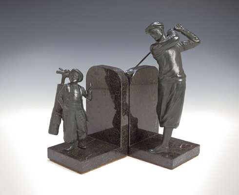 depicting, respectively, a golfer in the follow through and a diminutive caddy with bag of clubs, each on a variegated black/green marble base, circa 1930, the largest 23.5cm high