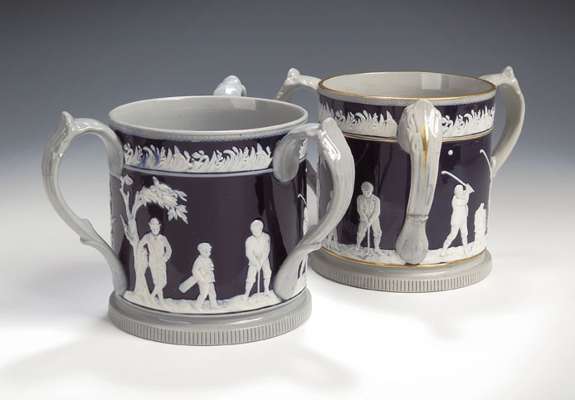 the circular section body relief moulded and decorated in white in the round with a scene of golfers and caddies in a landscape, on a two-tone blue ground, three foliate scrolled handles, printed and impressed marks to the underside,