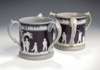 the circular section body relief, moulded and decorated in white in the round with a scene of golfers and caddies in a landscape, on a two-tone blue and gilt decorated ground, three foliate scrolled handles, printed and impressed marks to the underside, 14cm (5 1/2in) high.