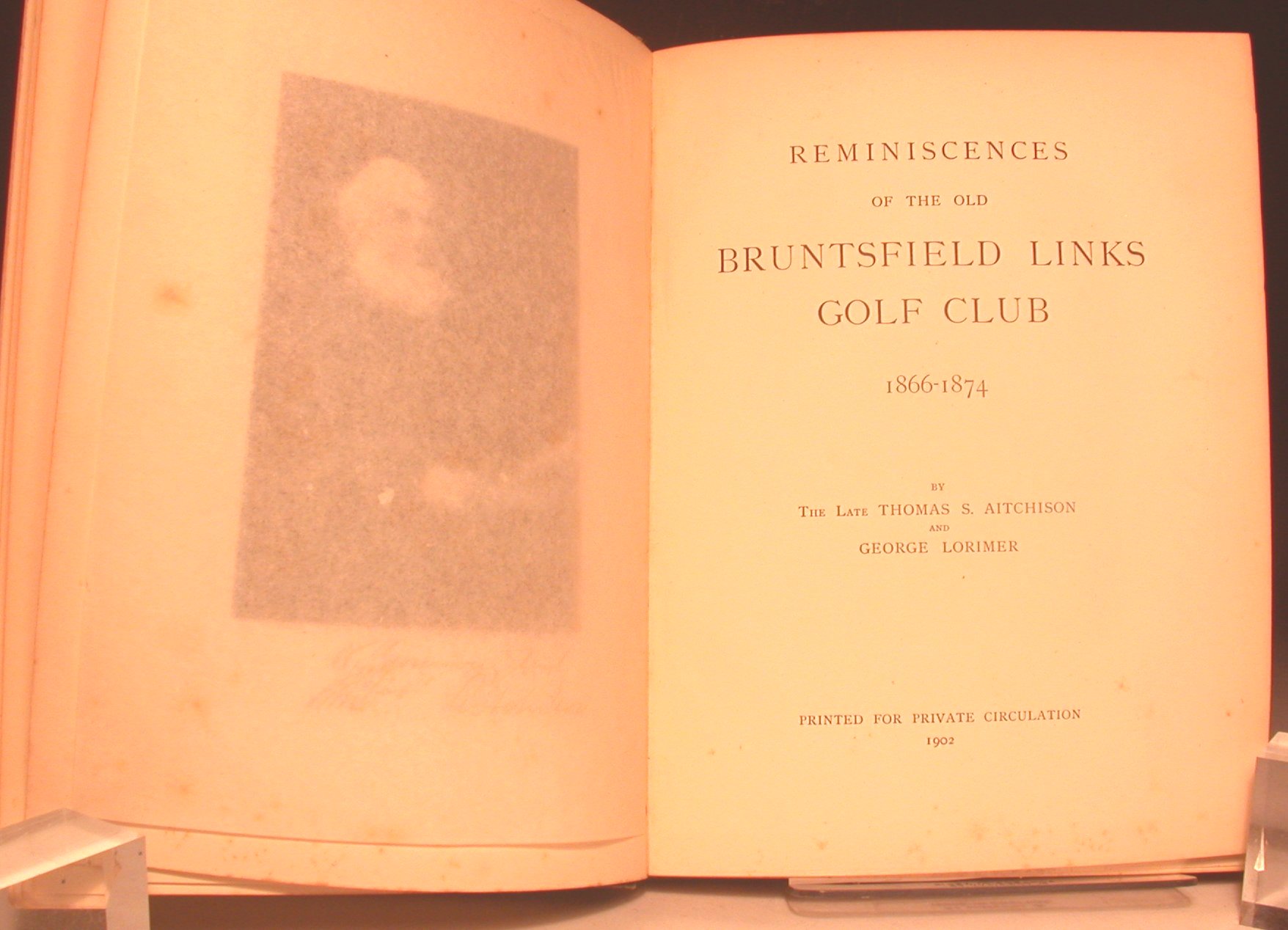 Reminiscences of the Old Bruntsfield Golf Links Golf Club, 1866-1874... 1st edition, photogravure frontispiece portrait of Thomas Aitchison from a photograph by William Crooke with facsimile autograph of Aitchison, gilt lettered blue cloth, t.e.g., Privately printed, Edinburgh, 1902