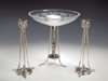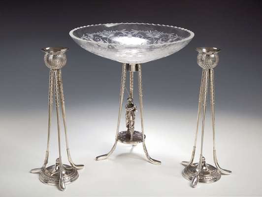 formed as three upright, longnose clubs, conjoined by a naturalistic circular platform surmounted by a figure of a golfer, the whole supporting an etched glass circular dish,