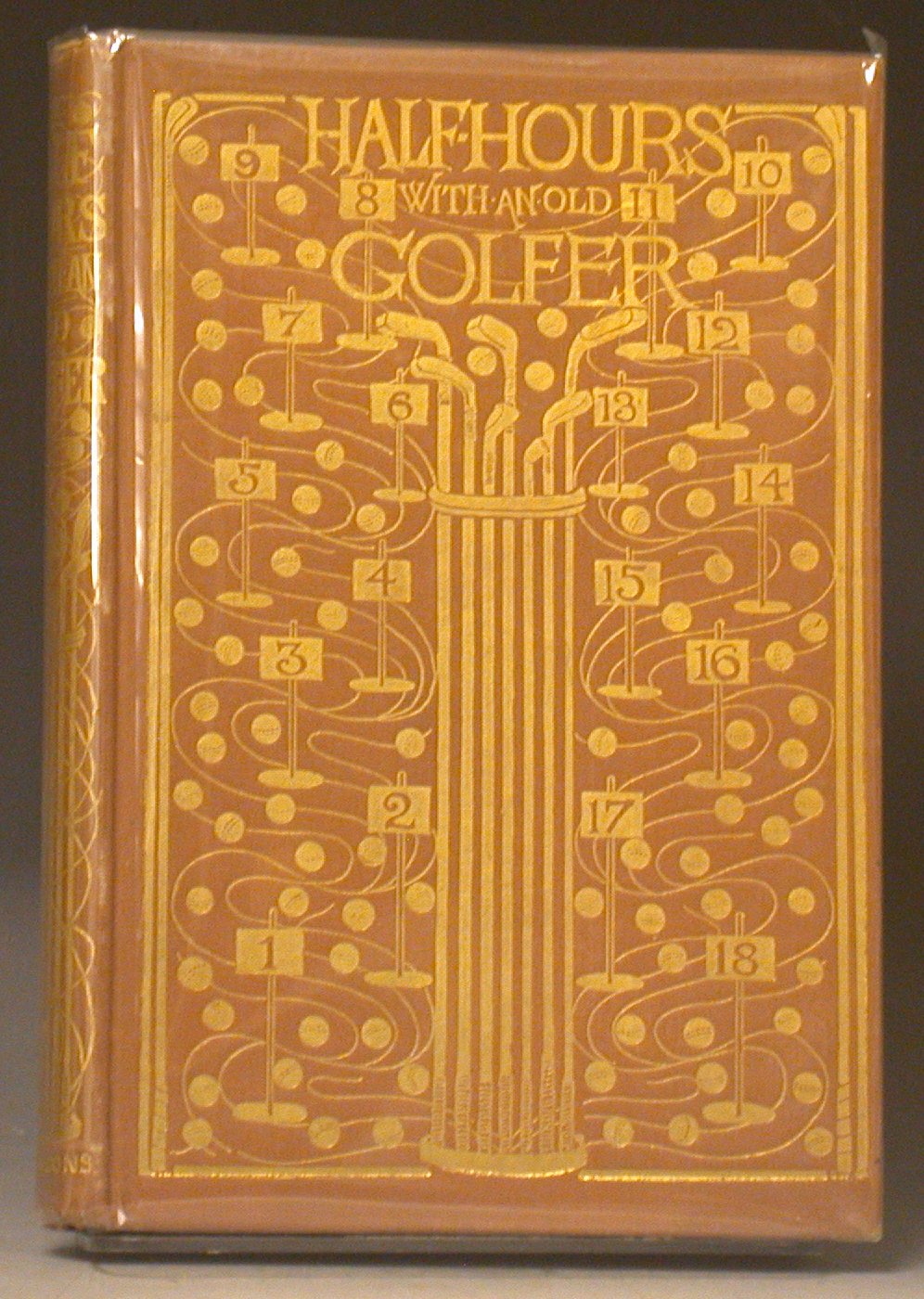 Half Hours with an Old Golfer... 1st edition, illus., frontis., tissue-guard, plus several wood engravings and figure drawings throughout by G. A. Laundy, decorative brown-orange cloth, stamped in gilt, George Bell & Sons, London, 1895, bears Schulenburg Library stamp